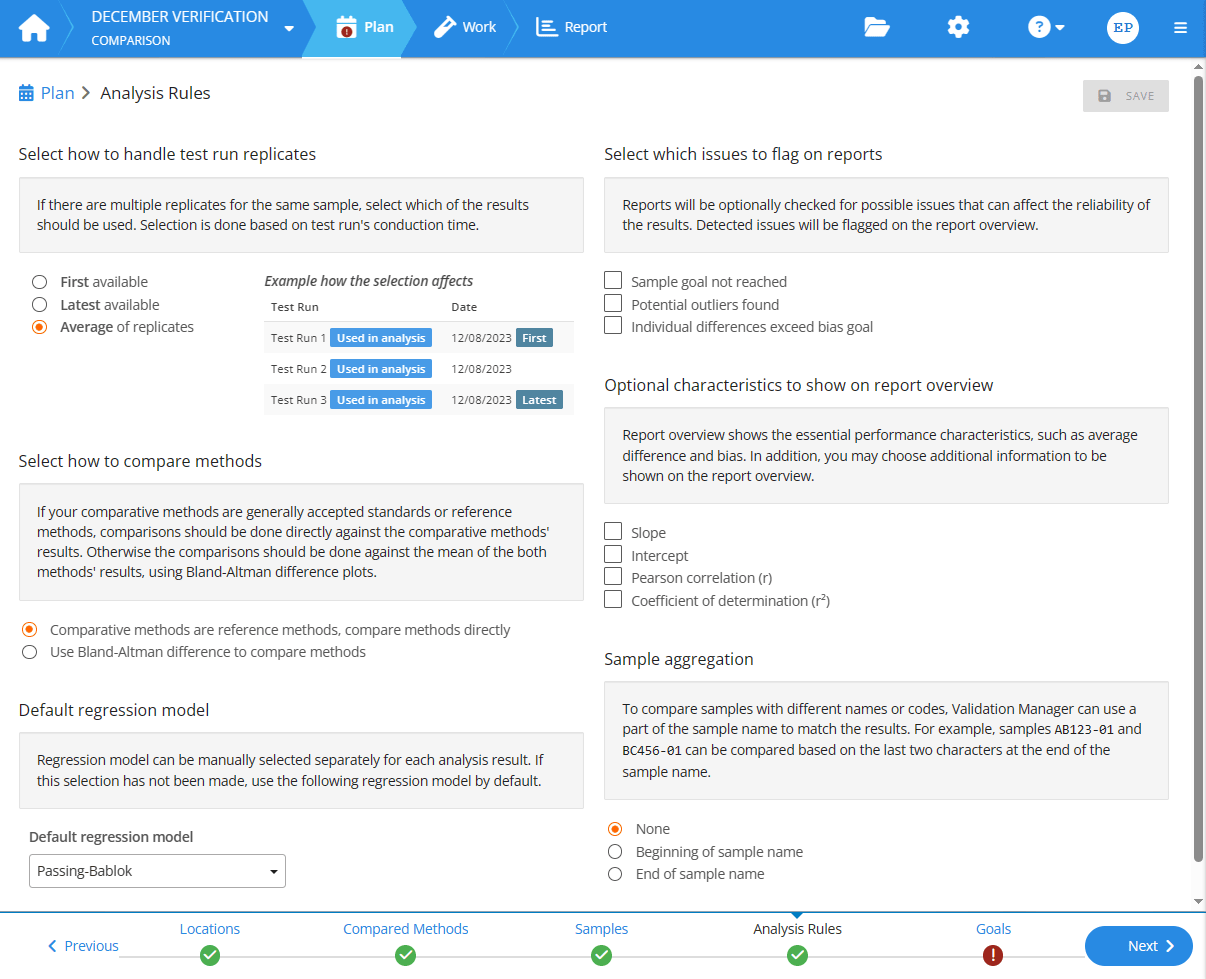 The next step that sometimes causes confusion is defining analysis rules. The most important rules to consider are how to handle test run replicates and how to compare methods, i.e., the first two settings on the left side of the screen.