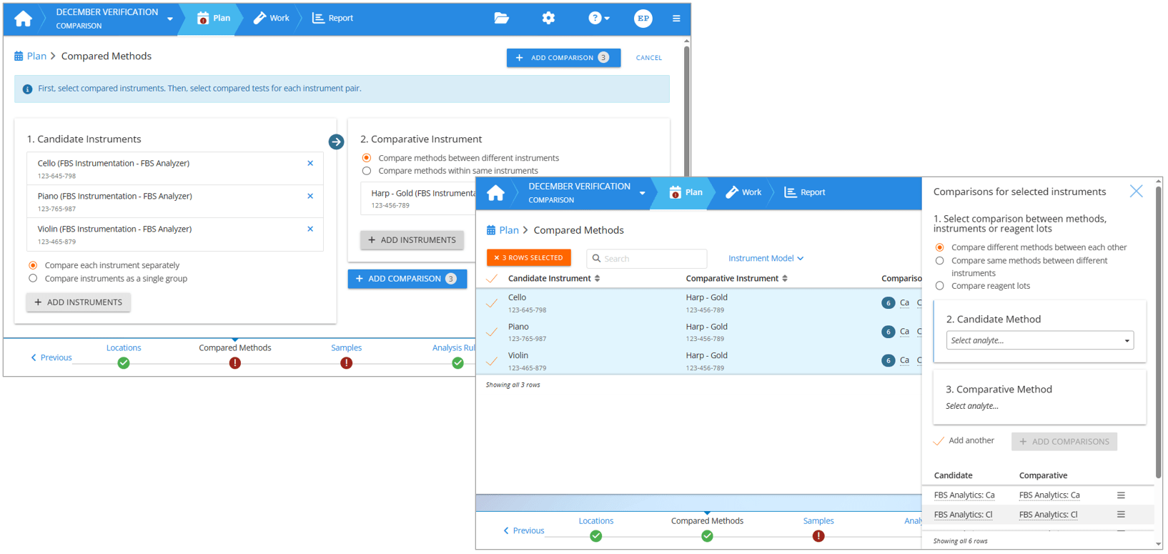To build the comparison pairs, first select the analyzers you are verifying as candidate instruments. Then select your old analyzers or other reference devices as comparative instruments. If you are comparing reagent lots or tests within the same instrument, you can use your candidate instruments also as comparative instruments.