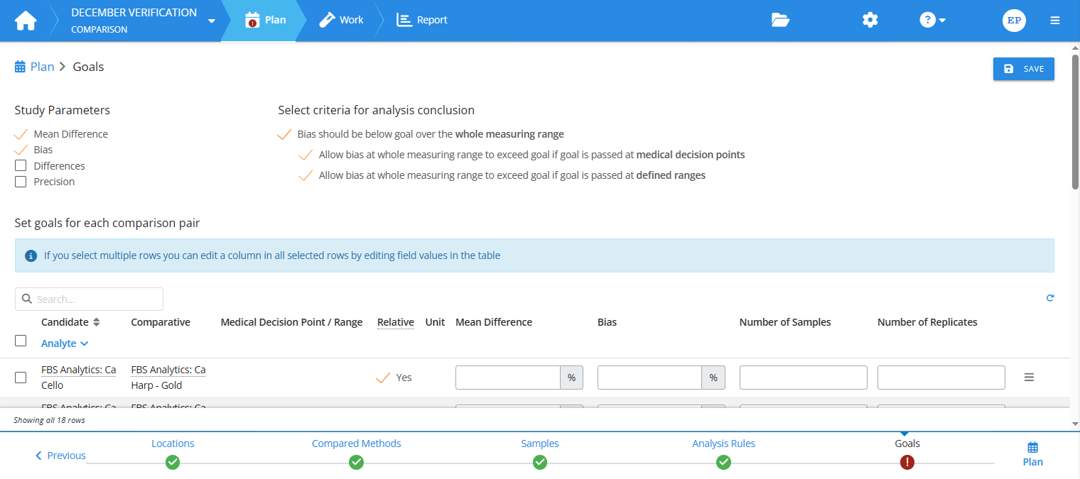 Planning goals in the Comparison study. First, select study parameters. Then, set goals for these parameters and for sample collection.