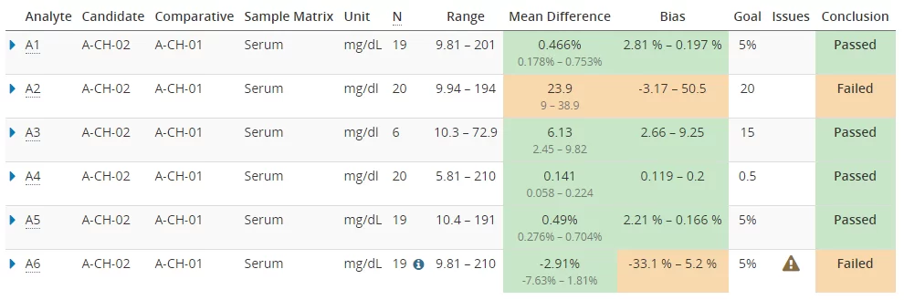 When using Validation Manager, it’s easy to find the confidence intervals of your results. Image 7 shows the overview report table with some example data. For every comparison pair, the table shows the measuring range, mean difference, and bias calculated using the selected regression model. Results are highlighted with green or orange color depending on whether or not the calculated values are within set goals. Below the calculated mean difference, the 95% confidence interval is shown.
