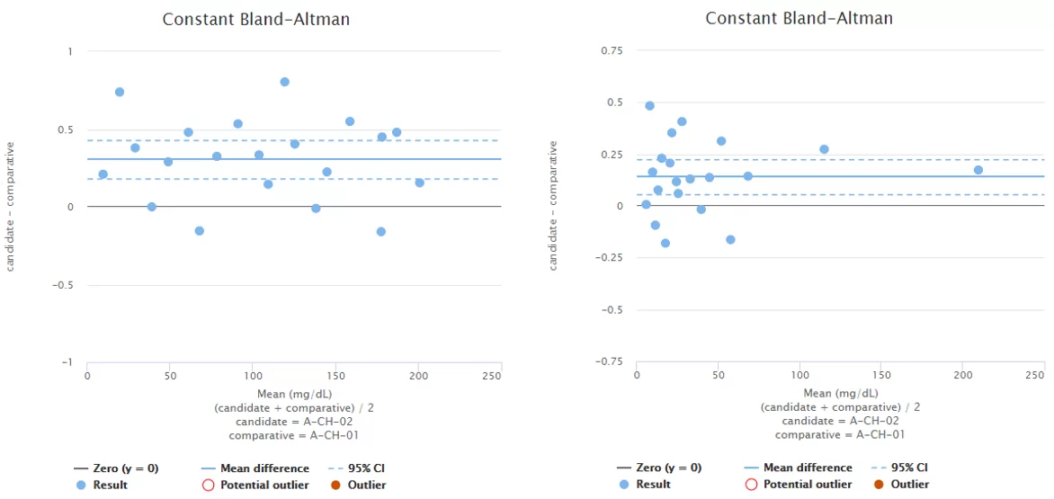 To give you and example what this could mean, Image 3 shows constant Bland-Altman plots of two different fictional data sets. On the left, data is distributed evenly throughout the measuring range. On the right, there’s quite a lot of data at low concentrations but only a couple of data points at high concentrations. If high concentrations are medically relevant, it is advisable to add more data to high concentrations.