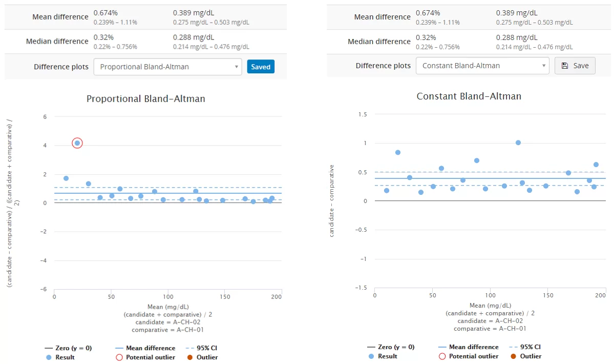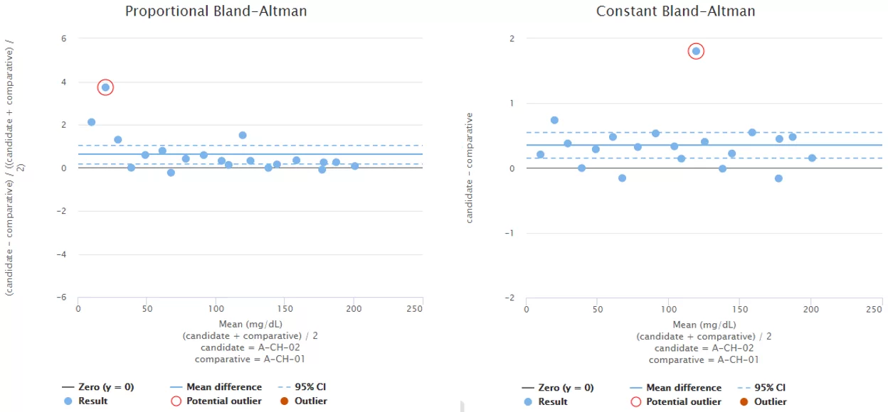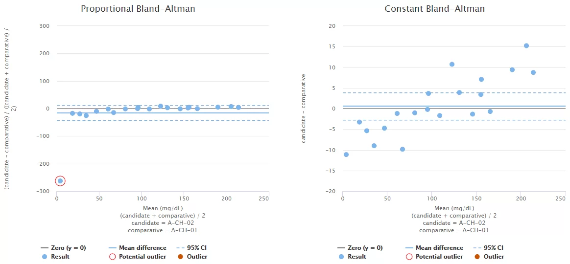 To give you an example, Image 5 shows Bland-Altman plots using proportional (on the left) and absolute (on the right) scale. Both graphs visualize the behavior of the same fictional data set. Statistical analysis on the data reveals one possible outlier on both of the graphs and Validation Manager highlights them with a red circle. Before marking an outlier, we need to consider whether the behavior of the data is better described on proportional or on absolute scale. Only after that we can know which one of the circled data points would be a statistical outlier. Other considerations may also be needed before marking an outlier.