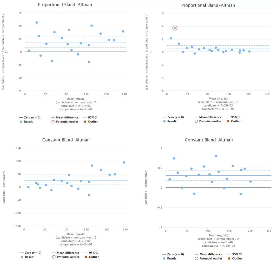 To demonstrate this, Image 4 shows examples of two fictional data sets. On the left, you can see proportional and constant Bland-Altman plots of a data set with sample concentrations distributed evenly throughout the measuring range. Looking at the graphs on a proportional scale, the data set seems like it may be described by average bias, as the blue horizontal line that represents the mean difference is quite nicely fitted into the data set. However, on high concentrations, all the dots are above the mean difference, which may be due to variance in the results but may also indicate growing bias. To be sure, one might measure more samples with high concentrations. On the right, there are proportional and constant Bland-Altman plots of another data set with sample concentrations distributed evenly throughout the measuring range. Looking at the graphs, on a proportional scale, one might think that bias varies throughout the measuring range, and there seems to be one potential outlier, but on a constant scale, the bias seems constant, and there are no outliers.