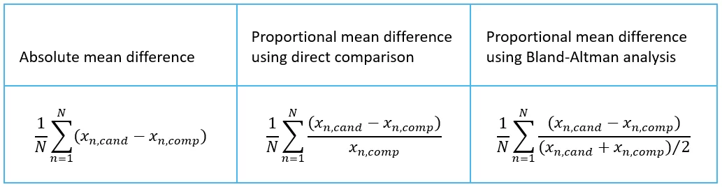 Image 6: Equations for calculating mean difference, where xn,cand is a value measured from sample n using candidate measurement procedure, xn,comp is a value measured from sample n using comparative measurement procedure, and N is the number of samples.