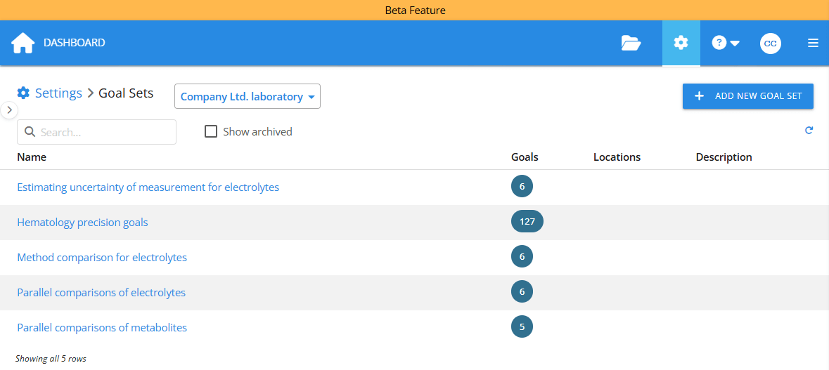 In Validation Manager Settings, quality managers can add new goal sets for different purposes. You can gather all the EFLM goals into one goal set, or you can divide it into multiple sets to manage different analyte groups or locations separately, enabling each department to manage their own goals. You can also have different goal sets for different types of studies. For example, you can have one goal set for your periodic parallel instrument comparisons.