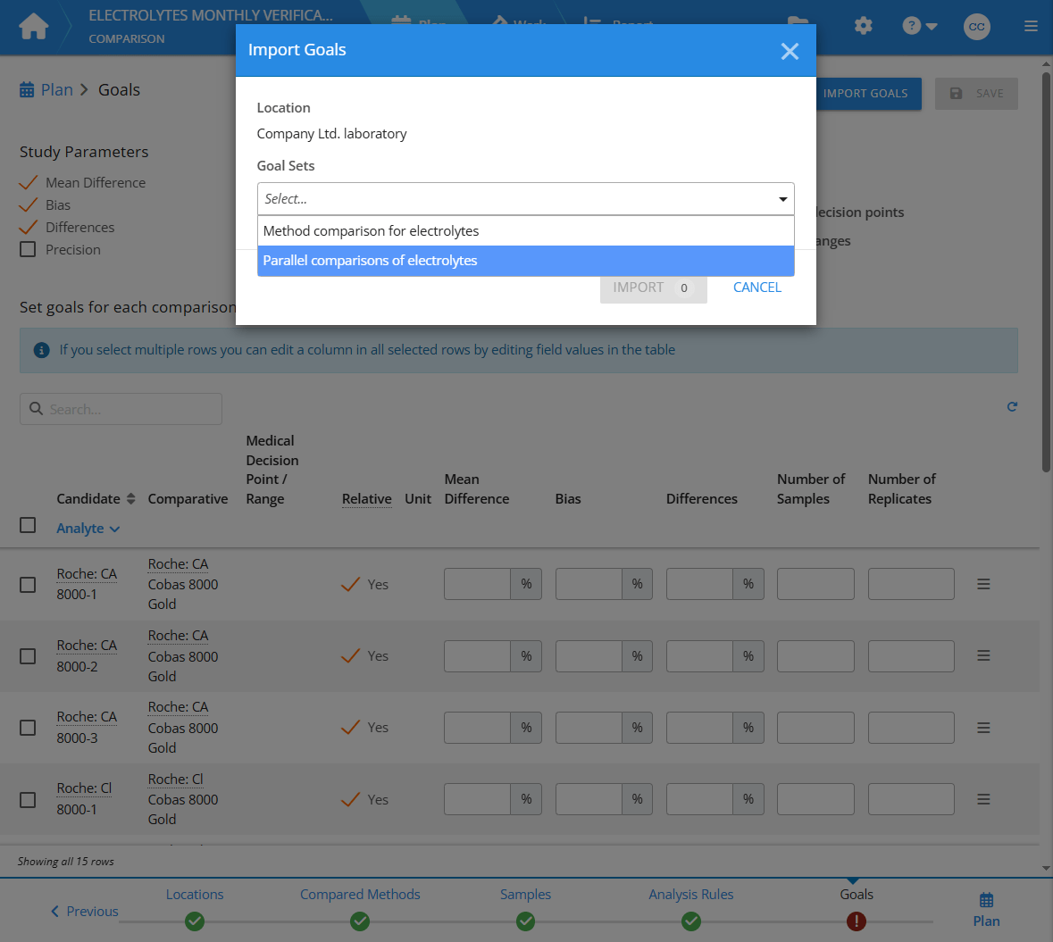 When users plan their studies, they can import goals simply by pressing a button and selecting the correct goal set. For now, this feature is only available for quantitative studies Comparison, Precision (ANOVA), and Quantitative Accuracy.