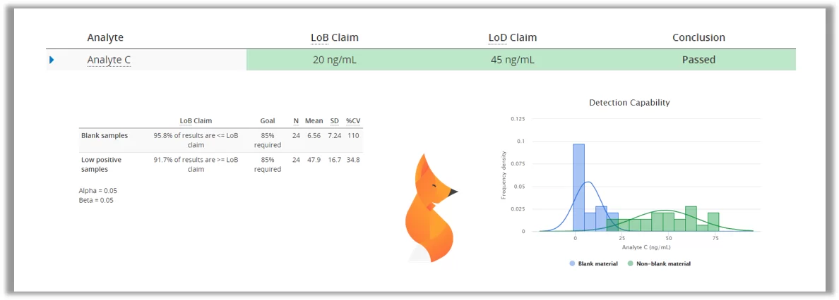 With most laboratory tests, even negative samples have a high probability of giving low results that would indicate the presence of e.g. COVID-19 antigen. Therefore we need to measure a set of negative samples to establish limit of blank (LoB), a value under which the results should be interpreted as negative. After that we would measure a set of low positive samples to establish limit of detection (LoD), the lowest amount of antigen that can be reliably detected. In Validation Manager, these values can be easily calculated by importing your data to Classical Analytical Sensitivity study.