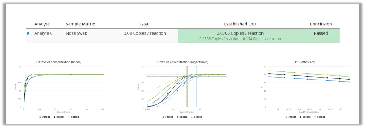 PCR technology is used for detecting the RNA of the COVID-19 virus from a sample. PCR is very good at detecting really small amounts of germs, and the technique of multiplying RNA/DNA makes sure that negative samples should not be mixed with low positive samples. Therefore we can assume that LoB=0 and only measure a dilution series of low positive samples to establish LoD using probit approach. This can be done easily by using Analytical Sensitivity study in Validation Manager.