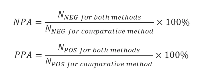 The reported values are negative percent agreement (NPA) and positive percent agreement (PPA). NPA is the ratio of the number of samples measured negative with both methods to the number of samples measured negative using the comparative method. That means that it describes the ability of the candidate method to categorize as negative the samples that the comparative method categorizes as negative (or in other words, the ability to agree about samples that the comparative method finds negative). Similarly PPA is the number of samples measured positive with both methods, per number of samples measured positive using the comparative method, i.e. it describes the ability of the candidate method to categorize as positive those samples that the comparative method categorizes as positive. The equations are shown below.