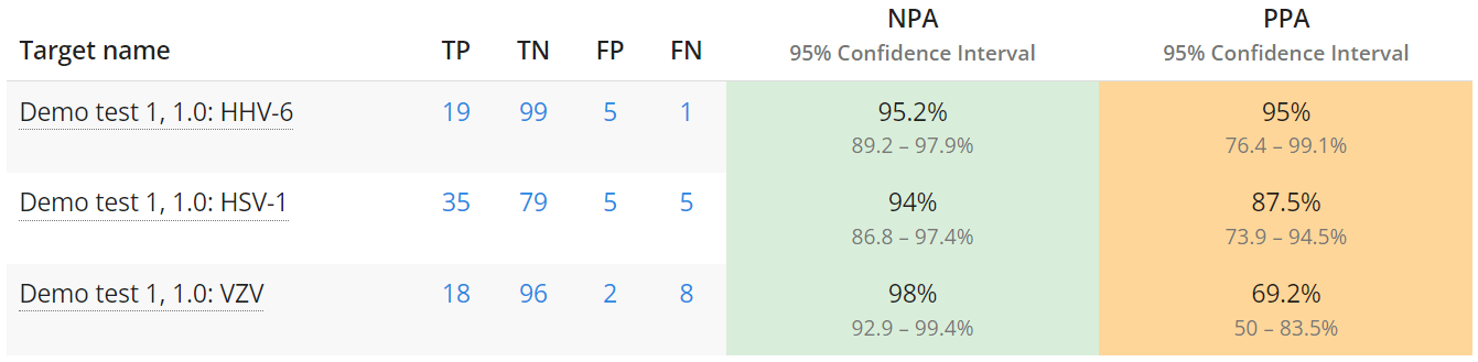 For example when comparing a new method to an old one, having 100% NPA and PPA means that changing the method does not affect the results our laboratory is producing. And if we are comparing two instruments running the same tests, having 100% negative and positive agreement means that we can trust the test to give the same results regardless of which instrument we are using.