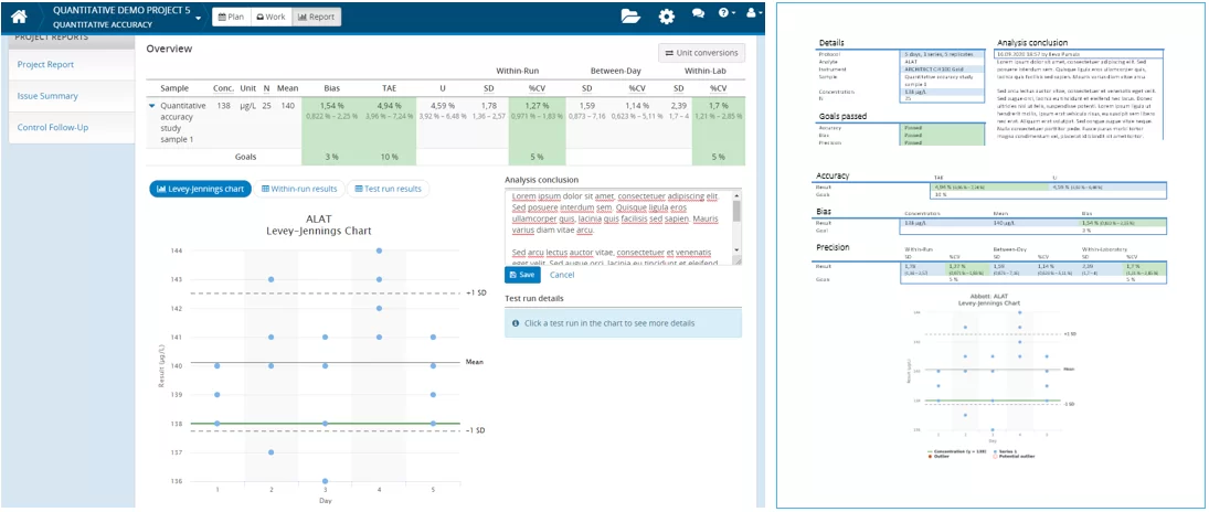 In Validation Manager you can easily add into the report detailed results of analytes whose conclusions have been edited. That way you can have a compact table overviewing all the verified analytes, showing an overall performance impression of the verified instruments. The graphs and conclusions will be presented only for those analytes that require more attention, making it simple to find the reasoning behind the conclusions. Leaving out the unnecessary details of results shortens your report and makes it easier to read.
