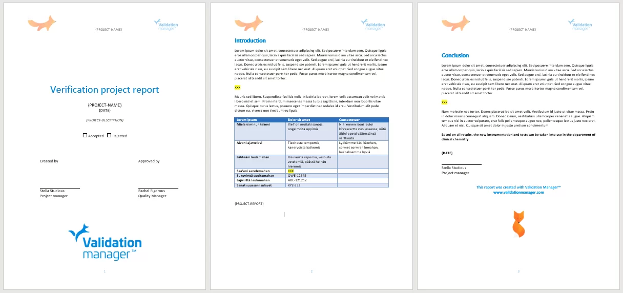 To make things as easy as possible, have this text in your report template. If there are text parts that really need manual modification in the Word document, you can highlight them e.g. with yellow in the template. When you download your report from Validation Manager, all you have to do is to find these highlighted places and replace them with required content.