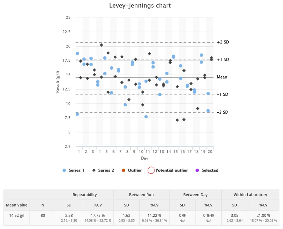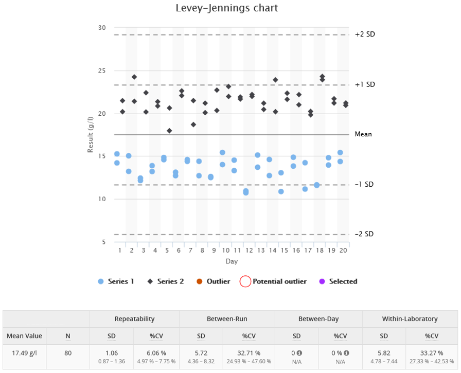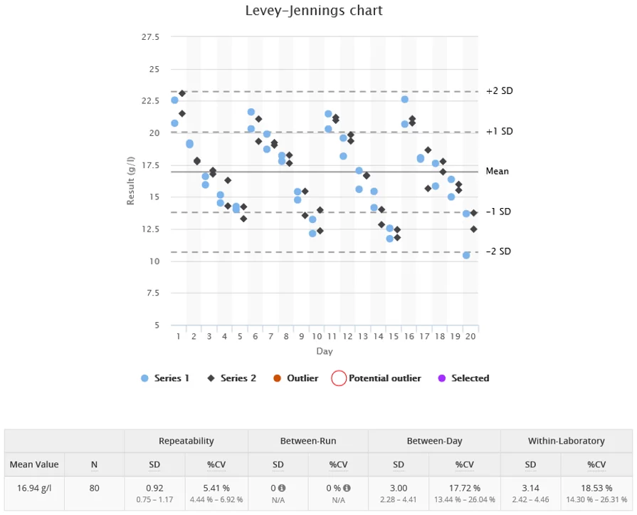 If some of the above precision components dominate the results, you may be able to trace the reason behind this and sometimes even make it better, For this, the Levey-Jennings chart can be a valuable tool as it visualizes trends in the data set.